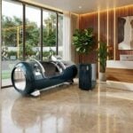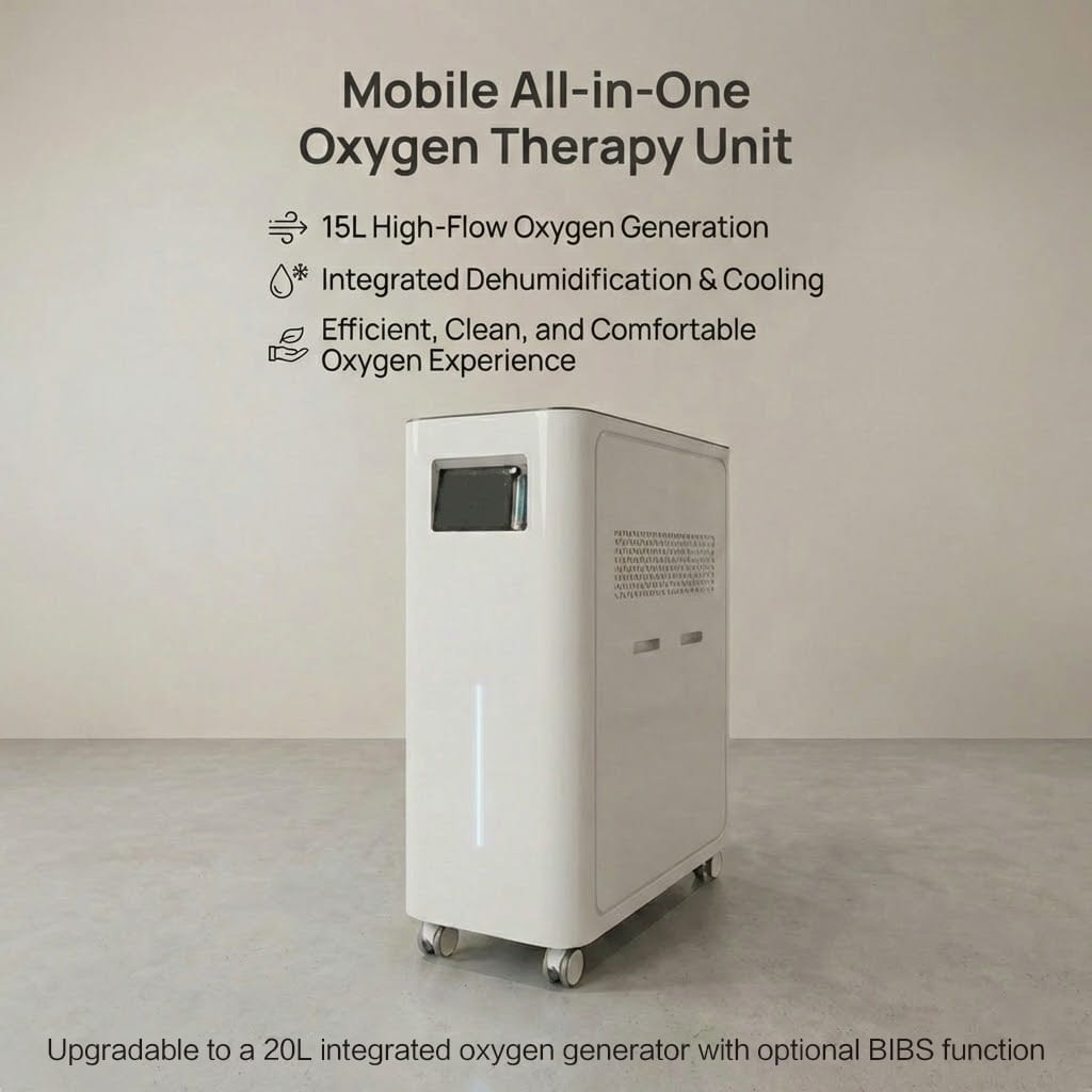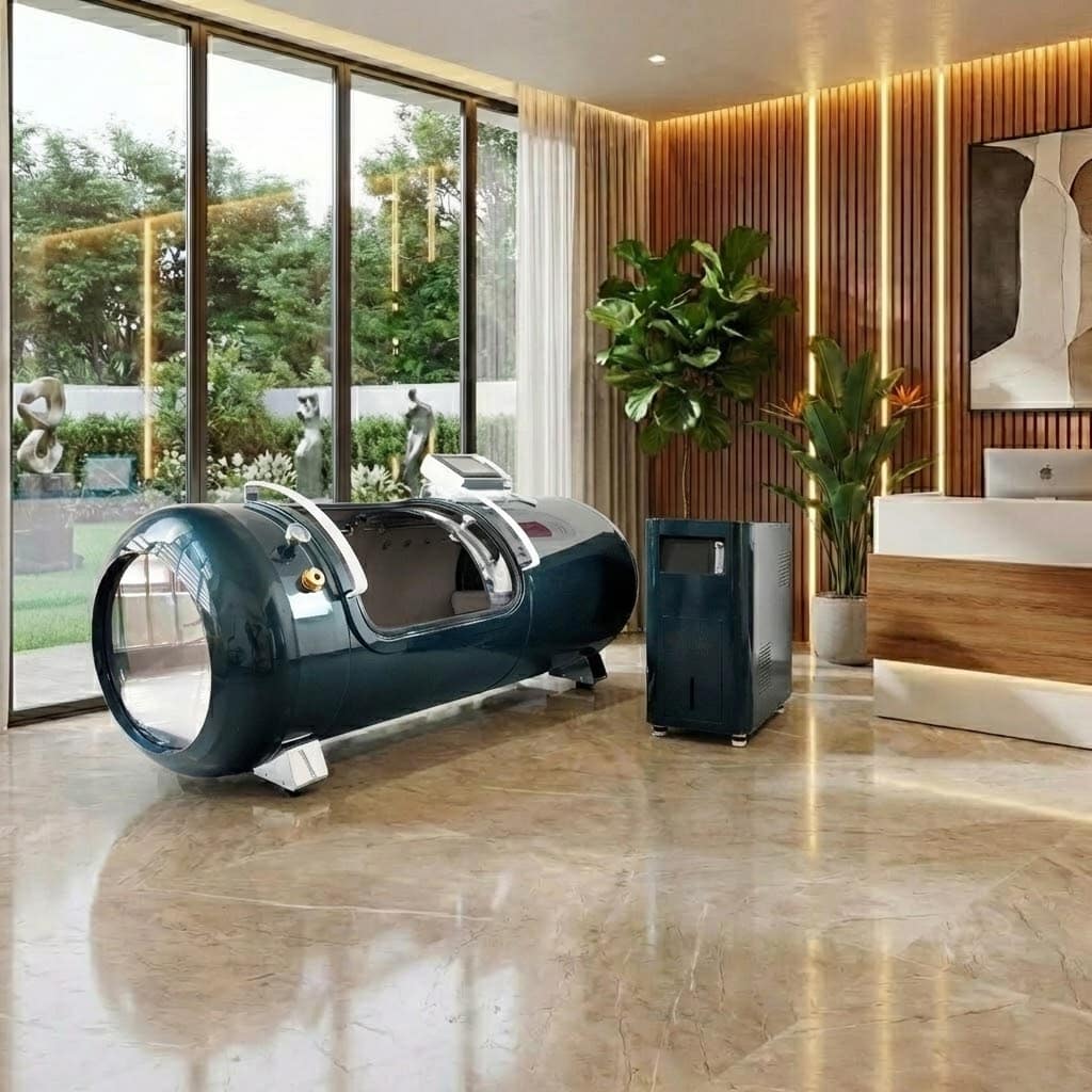 The hard-shell hyperbaric chamber supports pressures from 1.1 to 2.0 ATA (10-100 kPa) and is designed for single-person use. Its interior dimensions are 230 cm (length) x 85 cm (width). The stainless steel housing weighs 507 lbs (230 kg) and has a maximum load capacity of 550 lbs (250 kg). The integrated system weighs 198 lbs (90 kg) and has an oxygen flow rate of 15 liters/minute and an air flow rate of 180 liters/minute. Required installation space: 118 inches (width) x 59 inches (depth). Quality and performance are certified to ISO standards..